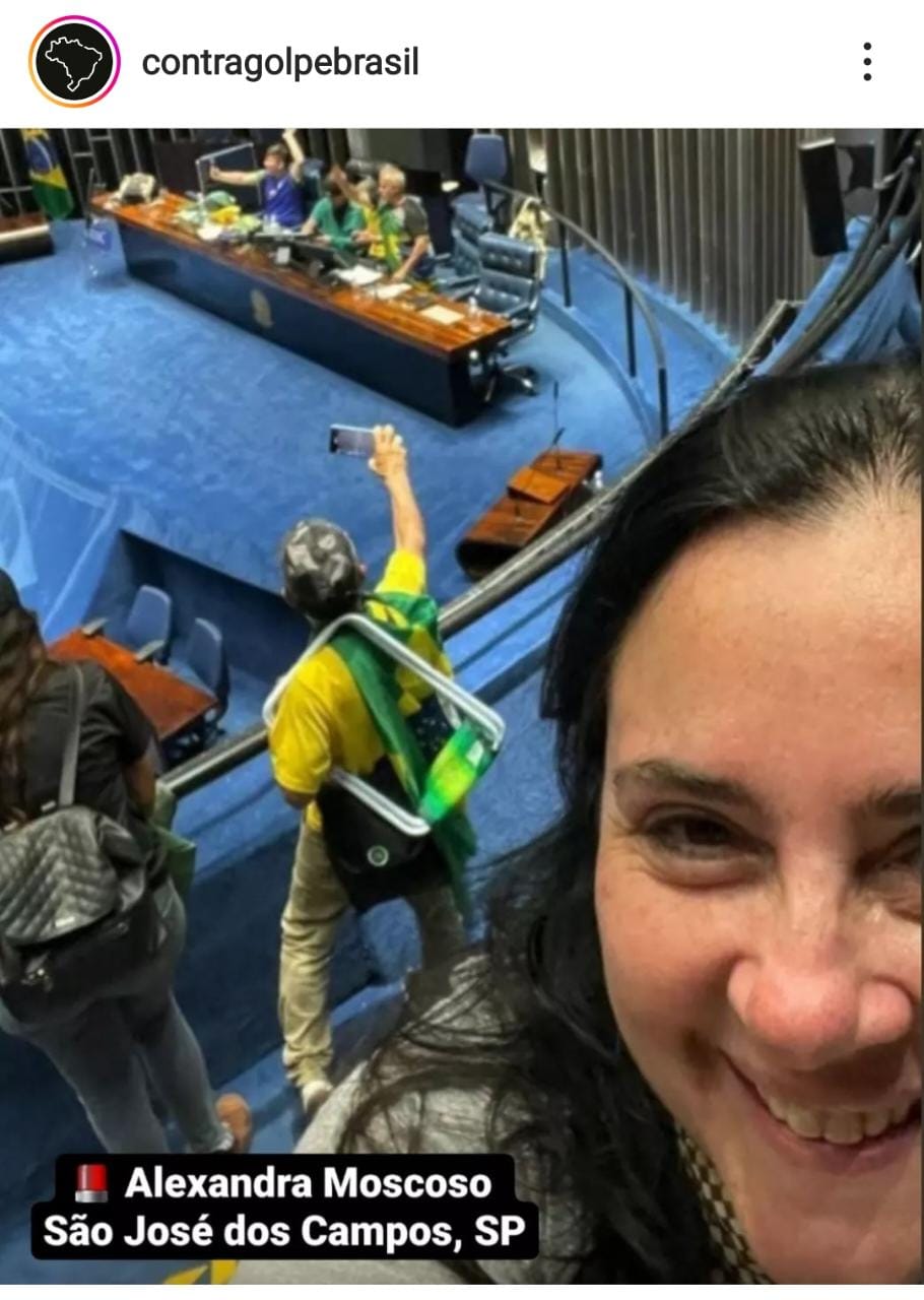 Uma mulher de São José dos Campos teve uma foto divulgada no perfil ‘contragolpebrasil’, criado para identificar pessoas que participaram do ato golpista em Brasília neste domingo (8) que resultou na destruição da sede dos Três Poderes, colocando em risco a democracia brasileira. Na postagem, ela foi identificada como Alexandra Moscoso.